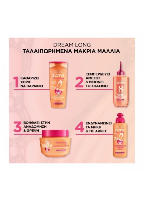 Η μάσκα αναδόμησης Elvive Dream Long εμπλουτισμένη με φυτική κερατίνη, βιταμίνες και καστορέλαιο, έρχεται να σώσει τα ταλαιπωρημένα μήκη σας προσφέροντας εντατική αναδόμηση και θρέψη.Χρήση Εφαρμόστε τη μάσκα μετά το σαμπουάν, αφήστε τη να δράσει για 2-3 λεπτά και ξεβγάλτε για εντατική θρέψη & ευκολο..